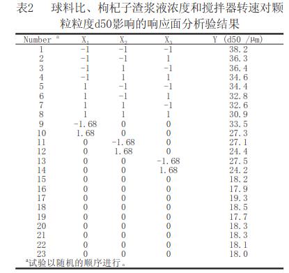 通過研究球料比、枸杞子渣漿液濃度、攪拌器轉速對枸杞子渣粒度的影響,得出如下結論: