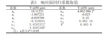 利用響應面分析法[1]化枸杞子渣超微粉碎工藝參數(shù)。在單因素預試驗基礎上,用SAS軟件系統(tǒng)進行響應面分析,設計一個三因素五水平的回歸方程來擬合因素和指標(響應值)之間的函數(shù)關系。選擇球料比(X1)、枸杞子渣漿液濃度(X2)和攪拌器轉速(X3)作為因素,以粉碎后的顆粒粒度d50作為響應值對球磨機濕法超微粉碎工藝進行化。